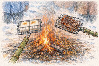 細竹などに魚焼き網をくくりつけたり、ただの笹竹にもちを刺したりします